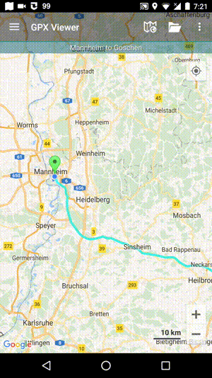 GPX Viewer can be used as a very simple navigation tool which will continuously align map position and rotation to device current position and orientation. For this usage you first need to open gpx or kml file in GPX Viewer which is described in How to open gpx or kml file. Note that GPX Viewer won't provide you turn-by-turn instructions. Below are instructions how to enable simple navigation functionality: