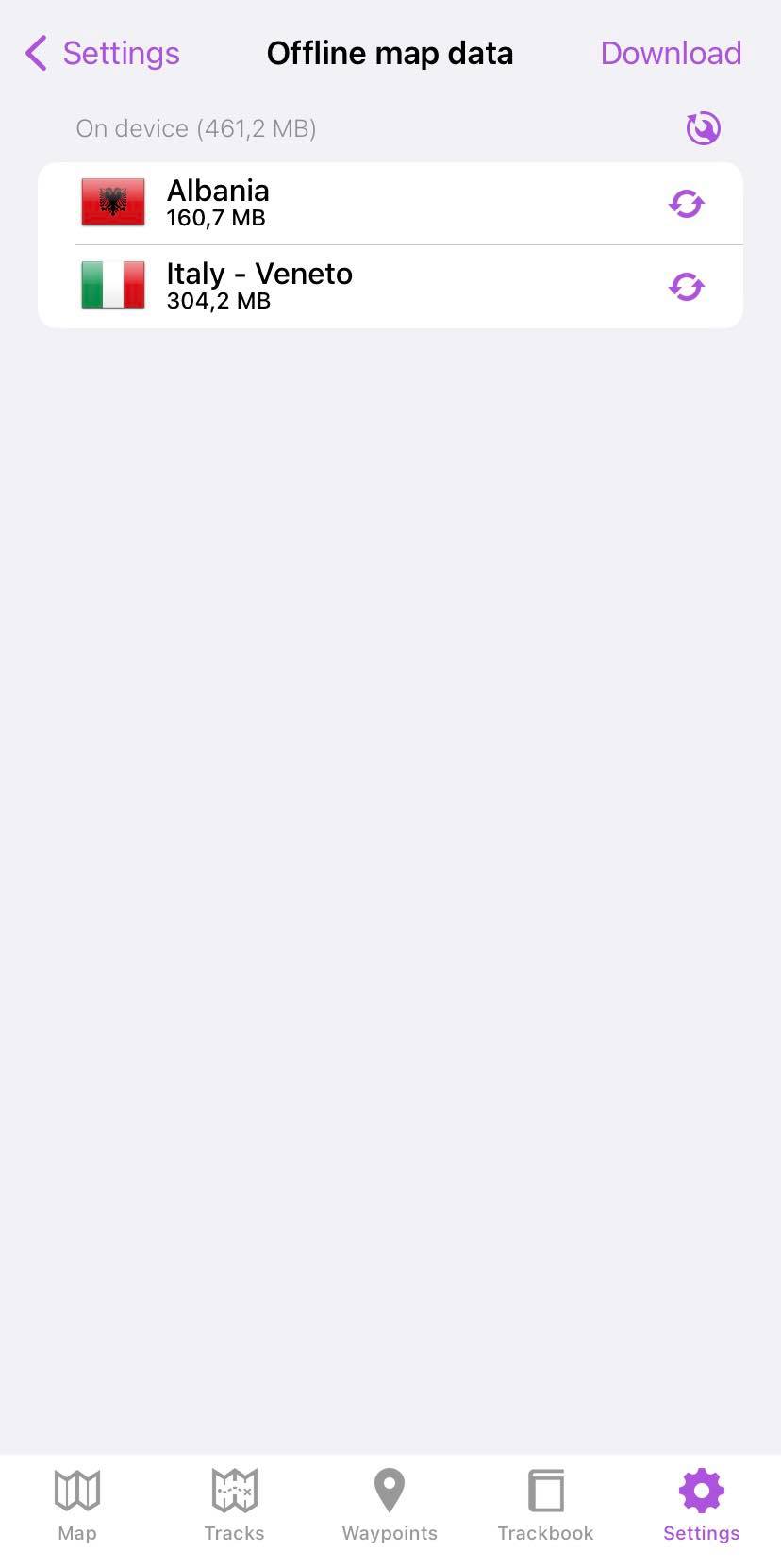 To get to manage offline map data you need to open Settings and scroll to the part of Offline Map. After tapping on this menu line the following screen will be displayed. The screen contains the maps that are already downloaded, maps data integrity check button and download button. Next to each downloaded map, there might be displayed an update button in case there is server newer version of map data. offline_map_downloads.jpg