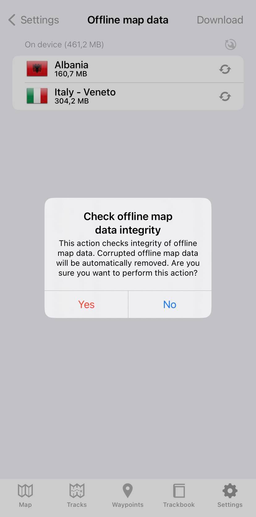 In case of a problem with the proper displaying of offline maps, the button of Offline map data integrity check can perform a test to see whether the downloaded data are okay. In case your problems with offline maps will still persists please report your issue here. offline_map_integrity.jpg