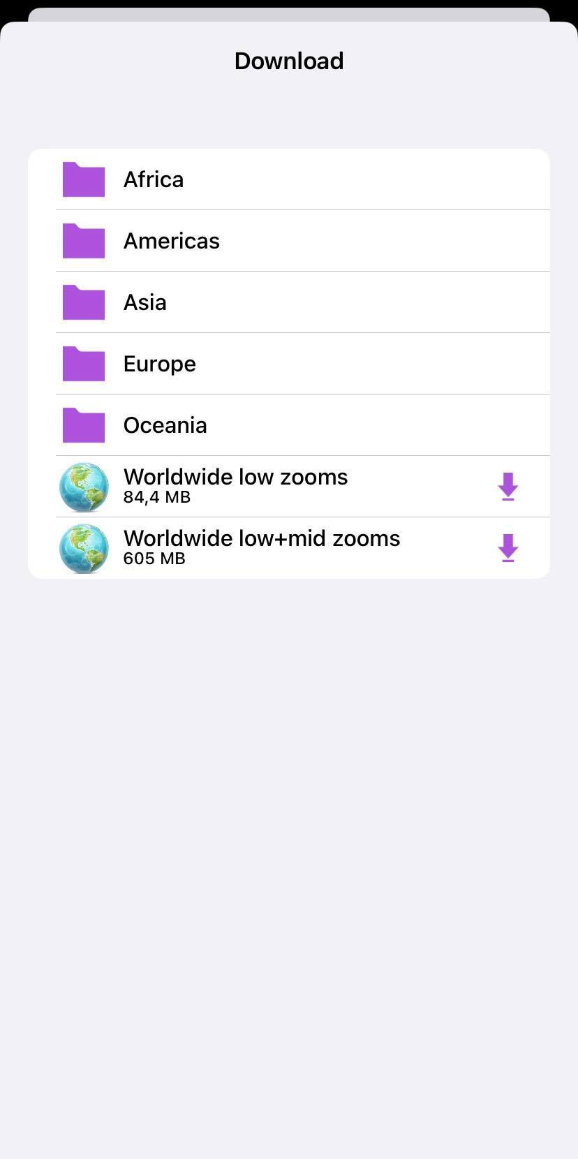 After tapping on the download button, the menu of map data is being displayed divided by continents and later by countries and territories and in the case of countries with a greater amount of map data also by regions.