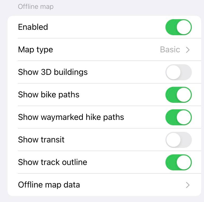 The settings start with enabling the offline map to be used. Once turned on, the online map automatically turns off and the map type that was last selected is used.