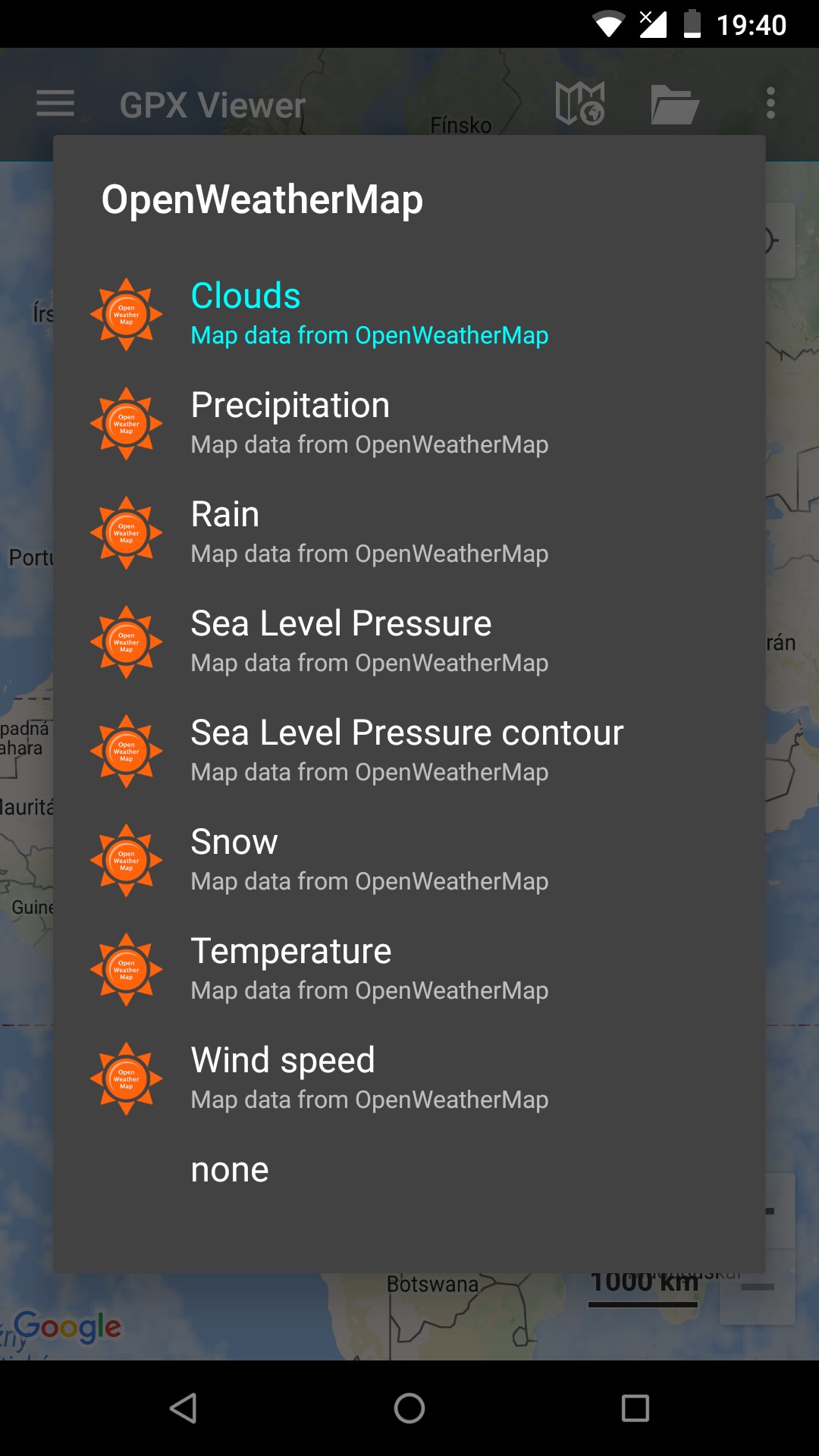 OpenWeatherMap is weather status information overlay over the online maps. OpenWeatherMap works only with online maps and it also needs device to be connected to internet. OpenWeatherMap has several overlays like Clouds, Precipitation, Snow, Temperature, Wind speed. Here you can find tutorial how to show OpenWeatherMap. Screenshot below is showing OpenWeatherMap overlays available in GPX Viewer.